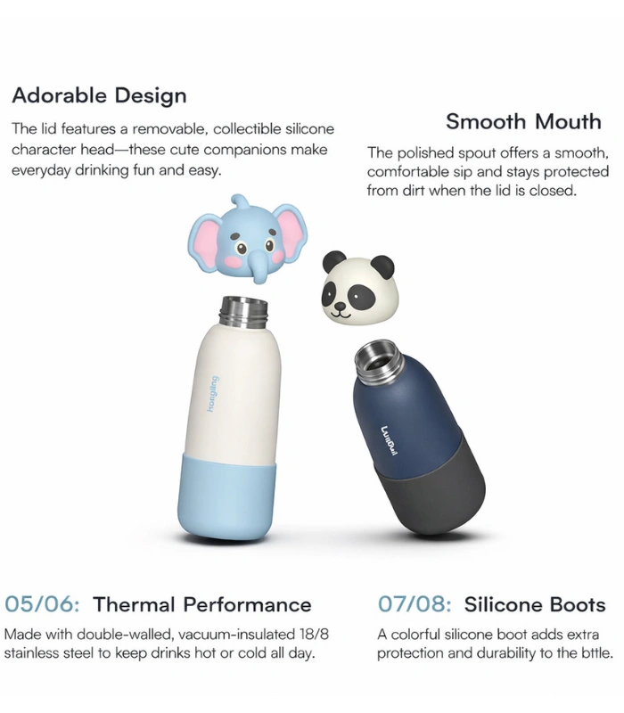 500ml stainless steel insulated water bottle for kids with removable silicone character lid. Keeps drinks hot or cold for hours. BPA free and school-ready.