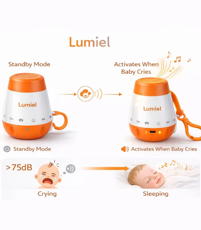 Portable baby sound machine with built-in cry sensor and 6 soothing sounds. Rechargeable, lightweight, and designed to help improve baby sleep at home or on the go.