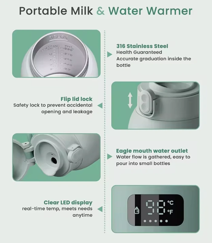 Equipped with a clear temperature display, the device allows you to monitor the warming level easily. This helps ensure milk or water is heated to a comfortable temperature.